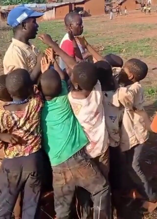 A group of approximately 15 children surrounds two men in a rural setting. The children appear to be of African descent and are dressed in various casual clothes. They are reaching upwards with their arms outstretched towards one of the men, who is wearing a blue cap, tan shirt, and black pants. He seems to be interacting with them, possibly leading a game or activity. The second man wears a white shirt with a red design. Another child holding a blue folder stands slightly to the side of the group. The background features several small, simple buildings with red roofs, suggesting a village. The ground is dry and reddish-brown, with patches of grass and vegetation. The overall atmosphere seems lively and engaging.