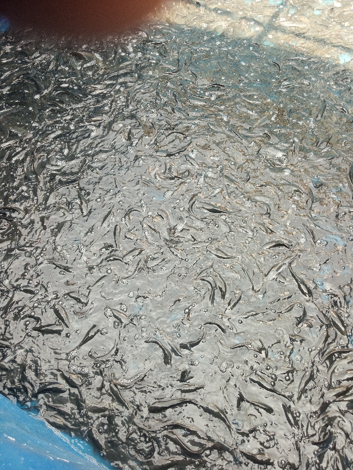 - "The image displays a dense aggregation of numerous small, dark-colored fish, identified as fry or fingerlings, actively swimming within a shallow, contained body of water" by FM-28kcB3, licensed under CC BY 4.0