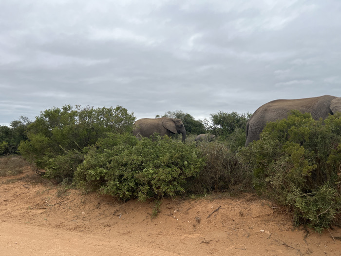 The image displays a natural landscape within Addo Elephant National Park, located in the Sundays River Valley Local Municipality, South Africa. The foreground consists of a reddish-brown dirt track with visible indentations. Above this, dense, green bushveld vegetation, comprising shrubs and small trees, extends across the midground and background. Three African elephants are present amidst this vegetation. A large elephant, with its rear torso and hind leg visible, stands partially obscured by bushes on the right side of the frame. Towards the middle-left, another elephant's head, face, and trunk are visible through breaks in the foliage. A smaller, juvenile elephant is partially discernible between these two larger animals, deeper within the dense scrub. The sky above is overcast with a continuous layer of light grey clouds. No human subjects are visible.