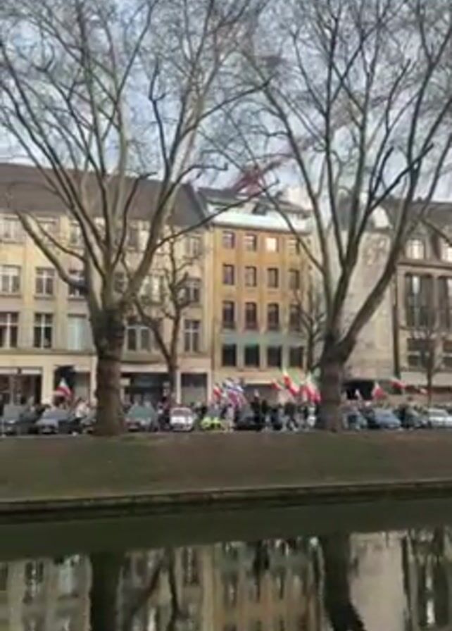 canal in an urban setting. On the opposite bank, a crowd of people can be seen lining the street. Many of them are holding flags, which appear to be red, white, and green. Cars are parked along the street as well. The buildings lining the street are multi-story structures of various architectural styles. Bare trees stand between the camera and the crowd, their reflections visible in the water of the canal. The sky is overcast.