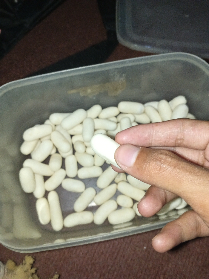 A hand holds a white, pill-shaped object over a plastic container filled with many similar objects