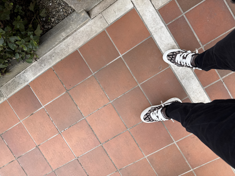 The image displays a top-down perspective of a person's lower legs and feet. The individual is wearing black trousers and a pair of white, brown, and black sneakers. The sneakers bear the "VALENTINO" brand name on the tongue and feature a repeating V-pattern across their upper material. The person is standing on a tiled surface composed of square, reddish-brown terracotta tiles with light-colored grout lines. To the right and upper right of the frame, a light grey concrete curb separates the tiled area from a patch of ground containing green foliage and small grey pebbles. The precise location within the city of Lozenets, Bulgaria, cannot be determined from the visual evidence presented in the image.