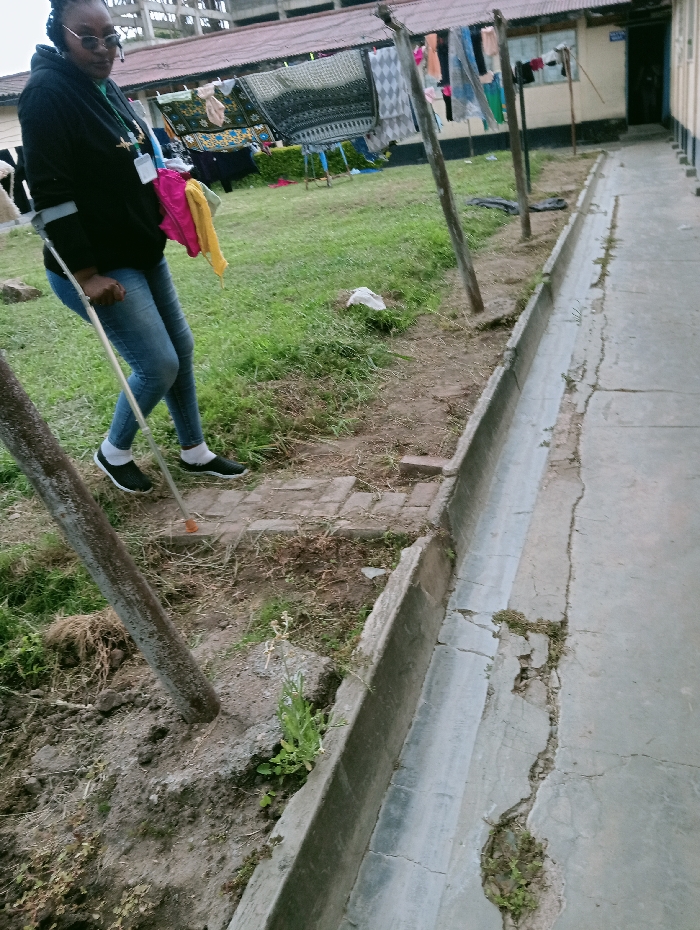 The image captures an outdoor scene within a compound in Machakos, Kenya. In the left foreground, a dark-skinned female individual is observed standing, oriented slightly to the right with her head turned towards the viewer. She wears dark sunglasses, a black hooded sweatshirt with white bands on the sleeves, light blue jeans, white socks, and dark sneakers. A lanyard with multiple attachments hangs around her neck, and several pieces of pink and yellow fabric are affixed to her person. She supports herself with a light-colored walking stick held in her right hand, the tip resting on the uneven ground. The immediate ground consists of sparse green grass and exposed soil. A concrete drainage channel runs from the foreground to the mid-ground on the right, bordered by a cracked concrete walkway. Small patches of vegetation grow within the cracks of the walkway and along the drainage channel. Two rough wooden poles, consistent with clothesline supports, are embedded in the soil in the mid-ground, with a third visible further back. Various items of laundry, including blankets and clothing, are hanging to dry on lines stretched between these poles and other unseen supports. In the background, a single-story building with a red corrugated roof and light-colored walls (cream and blue) is visible, featuring windows and a dark door. Beyond this building, a multi-story concrete structure, possibly under construction, is partially visible. The scene is illuminated by natural light, suggesting daytime.