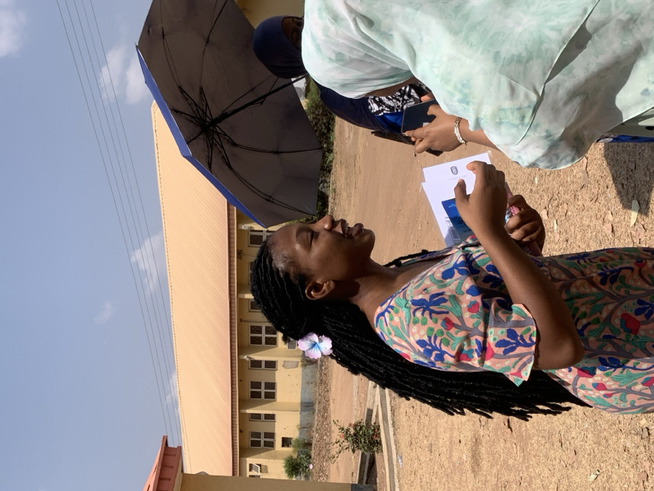An outdoor scene in Apata Yakuba, Nigeria, features three individuals under bright daylight. In the foreground, a young Black female with long dark dreadlocks, adorned with a light blue and purple flower on the right side of her head, stands in profile, smiling and speaking. She wears a peach-colored dress with a vibrant blue, green, and red floral pattern and holds several white papers or cards in her left hand, one of which has a prominent blue stripe. Facing her, partially visible on the right, is a second individual wearing a light green and white patterned hijab and garment. This person holds a black smartphone horizontally with both hands, appearing to interact with it; a silver-colored bracelet is visible on their right wrist. A third individual is partially visible behind the second, standing under a large blue and silver umbrella, wearing a dark blue head covering. The ground is unpaved and dusty. In the background, a large, single-story building with a light yellow/tan facade, numerous square windows, and a reddish-brown hip roof is visible under a clear blue sky. Utility lines stretch horizontally across the upper portion of the frame. A small green shrub is planted in a concrete planter near the base of the distant building.