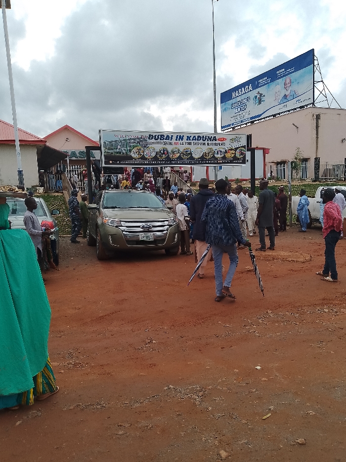 The image displays an outdoor scene in Rigasa, Kaduna, Nigeria, characterized by an unpaved, reddish-brown dirt road with visible tire tracks. The sky is overcast with dense grey clouds. In the mid-ground, a bronze-gold Ford SUV with a visible license plate "KADUNA KNT-094AA" is parked. To its immediate left, a person in a dark blue uniform, possibly security or police, stands near the vehicle's front fender. Further left, a silver sedan is partially visible. On the far left, a person in a teal-green garment with striped trim is partially visible, facing away from the viewer. Beyond the SUV, a large banner extends across the scene, advertising "DUBAI IN KADUNA" and "MAHA RAHAJAH MAHAMUD CENTRE FOR ALL YOUR SHOPPING REQUIREMENTS & EVENTS," featuring multiple product images. This banner marks the entrance to a building complex. Numerous individuals, predominantly adult males, are congregated near and beyond this entrance, standing and conversing. Their attire varies between traditional Nigerian garments and Western casual wear. To the right of the central crowd, a multi-story building features a large "NASAGA" billboard on its roof, displaying images of two men and the text "LIVING IS MY STOP." A white vehicle is partially visible on the far right. In the foreground, center-right, a male in a plaid shirt and jeans walks right-to-left, holding two closed umbrellas, one in each hand. A tall utility pole stands on the far left.