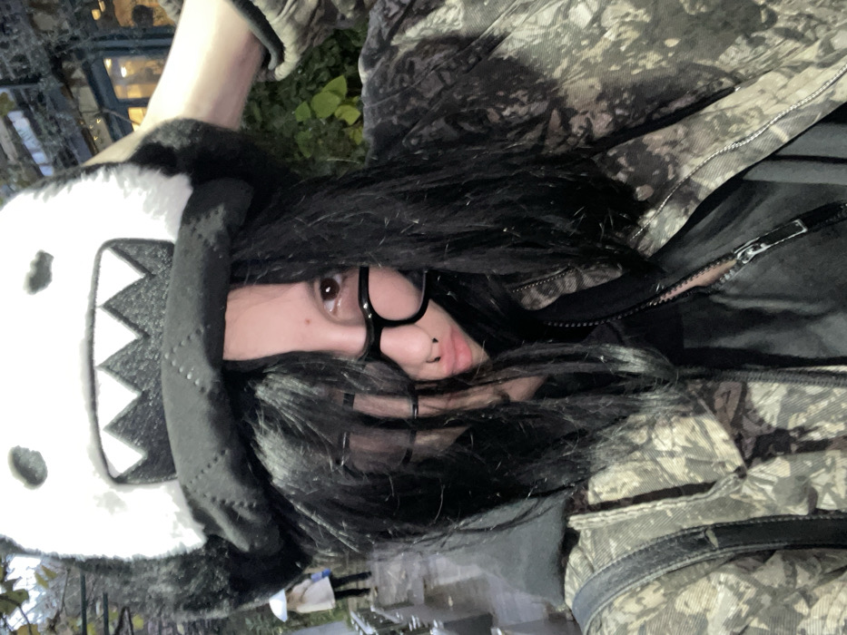 An individual is depicted in a close-up, chest-up outdoor shot, positioned in what appears to be an urban or semi-urban setting in the city of Budva, Montenegro. The subject has long, dark hair, partially obscuring their face, and wears black-rimmed glasses with a small septum piercing. Their brown eyes are visible and directed forward. They are wearing a white and black plush hat, designed to resemble a monster face with sharp black teeth and black side elements. The subject is dressed in a camouflage-patterned jacket over a dark, possibly black, zippered hooded garment. A dark strap, consistent with a backpack, is visible on the left shoulder. The left hand is slightly raised, near the head. In the blurred background to the left, a person holding a white umbrella is discernible on a wet pavement. To the right, blurred green foliage is present, with faint indications of a building featuring windows and interior lighting behind it. The ground surfaces in the background appear wet and reflective.