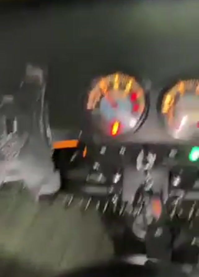 person riding a motorcycle on a street at night. The camera is mounted on the motorcycle, providing a first-person view. The street is paved and there are buildings and streetlights visible in the background. Cars pass by in the opposite direction. The motorcycle's speedometer is visible, showing the speed fluctuating around 38 kilometers per hour.
