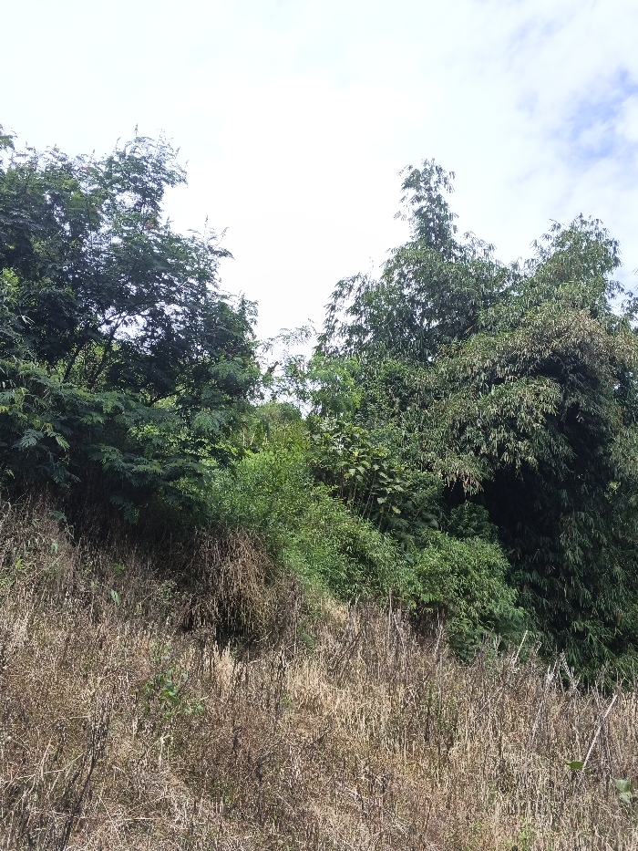 A hillside covered in dry, brown grass transitions to lush green vegetation halfway up. A dense collection of trees and bamboo clusters on the upper half. The sky is partly cloudy, creating a soft, diffused light. The landscape appears natural and untamed, with a mix of textures and colors ranging from the muted browns of the dry grass to the vibrant greens of the foliage.