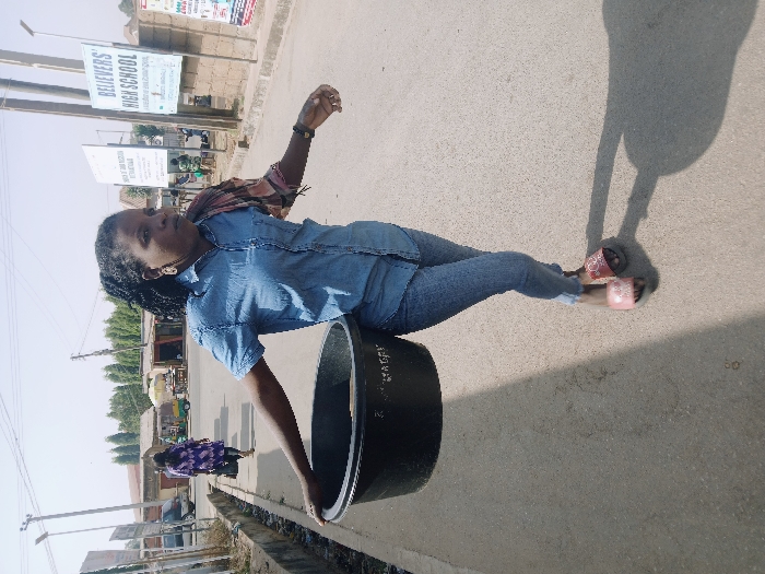 The image depicts an outdoor street scene within Mumbwa, Zambia. A female individual, exhibiting dark skin and braided hair, stands on a light grey paved surface under bright daylight. She is attired in a light blue short-sleeved denim shirt, blue jeans, and pink slip-on sandals. Her left hand rests on the upper rim of a large, black, cylindrical plastic container situated to her left. Her right arm is bent and slightly raised, with a dark wristband visible on her wrist. Prominent shadows of the individual and the container are cast on the ground to her right. In the middle ground, further along the paved road, a second individual in a dark purple patterned garment walks away from the camera's perspective. The background features several utility poles, two billboards (the upper one clearly displaying "BELIEVERS' HIGH SCHOOL"), various single-story buildings suggestive of commercial or residential use, and distant trees. A shallow ditch or gutter runs alongside the paved surface on the left.