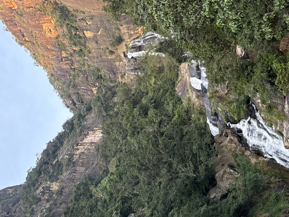 A scenic view presents a cascading waterfall against a backdrop of steep, layered rock formations. Lush greenery and trees line the cliffside, complementing the rugged texture of the stone. The sky is visible in the upper left corner, offering a contrast to the earthy tones of the landscape. The image is tilted, altering the perspective of the natural scene.
