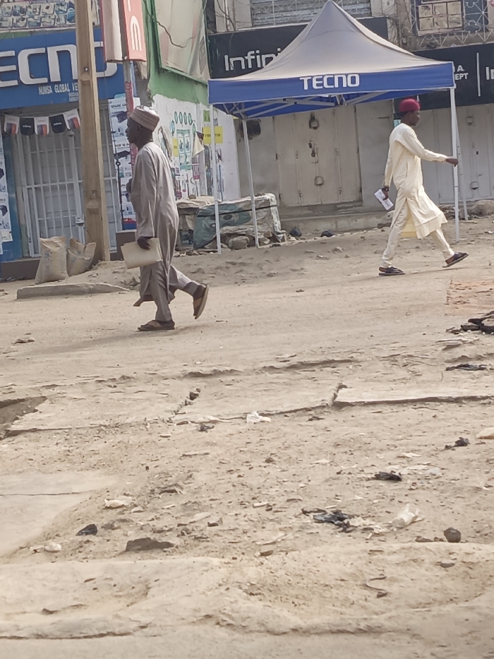 The scene depicts an unpaved, sandy street in Fagge A, Nigeria, under daylight conditions. Two adult males are walking in opposite directions across the rough terrain. The ground consists of dry, light-brown soil with visible cracks and scattered debris, including small pieces of plastic and dark refuse. In the background, multiple commercial buildings line the street. On the left, a building features a white metal roll-down shutter and a sign displaying "TECNO MUNSA GLOBAL VE." Several white sacks are placed near the building's base. A utility pole is positioned in front of this building. To the right, a blue and white portable canopy tent, emblazoned with "TECNO," is erected. Behind the tent, another building with a closed, corrugated metal shutter is visible, topped by an "Infinix" sign. Further right, another building with a closed facade is present. The first male, positioned on the left, is an older individual with dark skin, walking towards the left side of the frame. He wears a light-colored, long traditional tunic and a matching cap. He is wearing brown sandals and holds a light-colored rectangular object, possibly a document or book, in his left hand. The second male, positioned on the right, is a younger individual with dark skin, walking towards the right side of the frame. He wears a light cream-colored long tunic and trousers, paired with a red cap and dark sandals. He carries a small stack of white papers or leaflets in his left hand. Both individuals maintain a forward gaze, without apparent interaction with each other or the immediate surroundings beyond their movement.