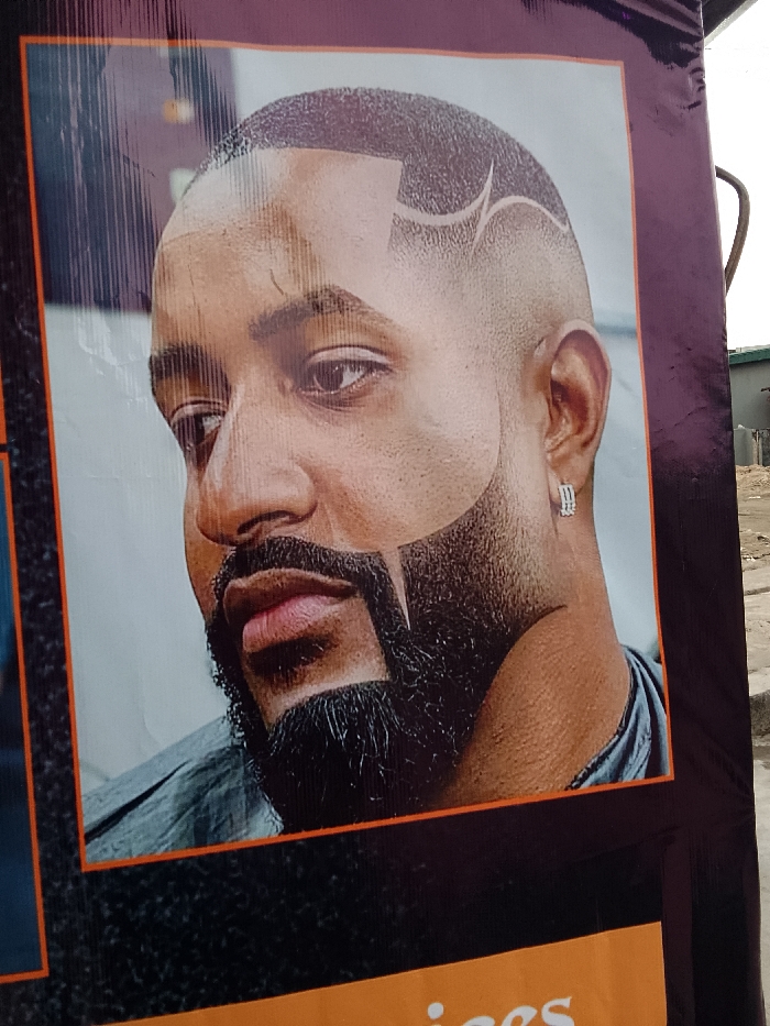 The image displays a vertical outdoor banner featuring a close-up portrait of an adult male. The man, with light brown skin, is shown in a three-quarter profile, looking slightly upwards and to the left. He has a dark, faded haircut with prominent, stylized curved lines shaved into the side of his head and a sharp, geometric hairline. His black beard is full, meticulously trimmed, and features a distinct angular cut on the cheek line, connecting to a mustache. A silver-toned, multi-segmented hoop earring is visible in his right earlobe. He wears a dark shirt. The portrait's background is light. The banner itself has a dark border, with an orange section containing partially visible text beneath the portrait, suggesting a business advertisement. Vertical creases are present on the banner's surface. The surrounding environment, indicative of an outdoor urban setting in Agani, Nigeria, includes a light-colored ground and faint background structures, visible to the right and top, under ambient daylight.