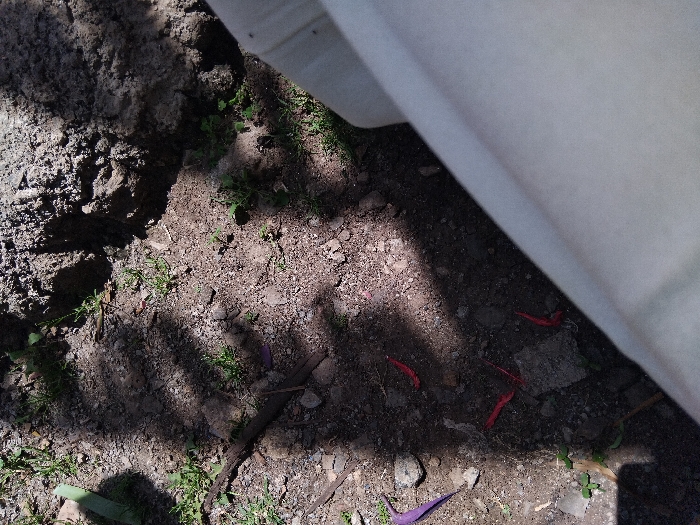 The scene depicts an outdoor ground area in Ngong ward, Kenya. The terrain consists of dry, compact soil intermixed with small stones, gravel, and sparse patches of green vegetation. A darker, raised earthen mound or rock outcrop is visible in the upper right quadrant. Multiple distinct shadows are cast across the ground, indicating direct sunlight from an elevated source. Approximately five elongated, vibrant red objects, consistent with fallen petals or small pieces of material, are scattered on the ground in the lower-central and lower-left areas. A single, distinctly purple, irregularly shaped object rests on the far-left side of the frame. The lower right portion of the image is occupied by a large, smooth, light-colored object, possibly fabric or plastic, partially obscuring the ground. No individuals or animals are present.