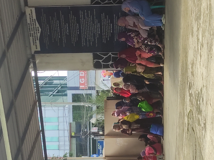 A group of people, predominantly women wearing hijabs, are seated along a wall. They appear to be waiting, possibly at a hospital or clinic. A sign for "IGD Emergency" is visible on a building across the street. A plaque with dense text is mounted on the wall behind them. The scene suggests a waiting area at a medical facility with people gathered for services or appointments.