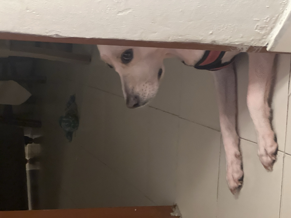 A white dog peeks over a ledge into a dimly lit space. The dog's head is tilted downward, and its legs dangle over the edge. The dog wears a black and red harness. The space below has a tiled wall and glimpses of furniture. The angle of the shot is unusual, making the dog seem to be floating.