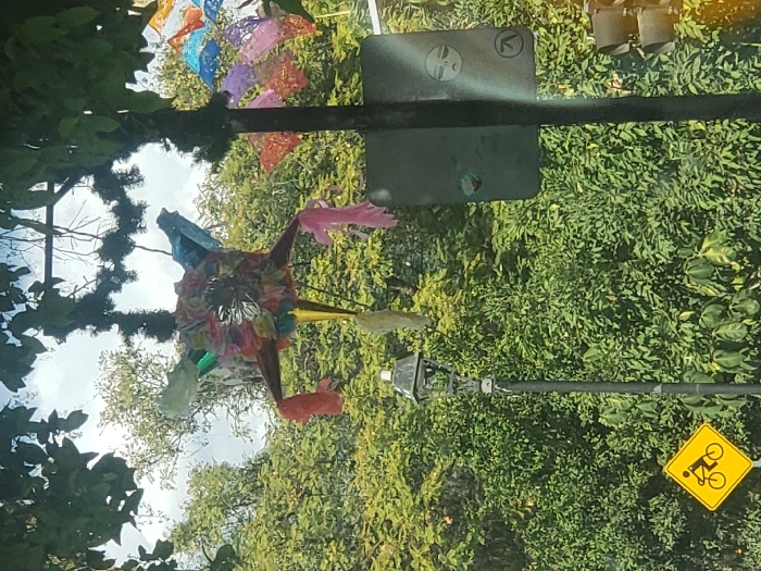 The image captures a colorful piñata hanging from a pole amidst lush greenery. Above it, vibrant papel picado banners are strung, adding to the festive atmosphere. A street sign and a bicycle crossing warning sign are also visible on the pole. The background is filled with dense foliage, creating a vibrant and natural setting for the celebratory decorations.