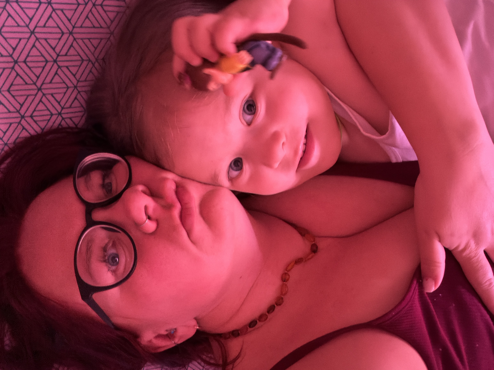 The image displays an adult female and a young child in an indoor setting in Chaikovsky, Russia, viewed from an overhead perspective. The scene is illuminated with a pervasive red/pink light. The adult female, positioned on the left side of the frame, has dark hair and wears black-framed eyeglasses. Her left nostril features a ring, and a small stud earring is visible in her left ear. A necklace composed of amber-toned beads is worn around her neck. She is clad in a dark, possibly maroon, camisole. Her expression is characterized by wide-open eyes looking directly at the camera and a slightly downturned mouth. Her left arm extends to embrace the child. The child, located on the right and partially embraced by the adult, appears to be a toddler with light hair and distinct blue eyes, also directed towards the camera. Two lower front teeth are visible. The child wears a white tank top. The child's right hand is raised near their head, grasping a small, brown-haired toy figure with a yellow top and blue pants. The child's expression is neutral to slightly smiling. Both individuals are lying on bedding that features a light-colored geometric pattern against the dominant red/pink hue of the environment.