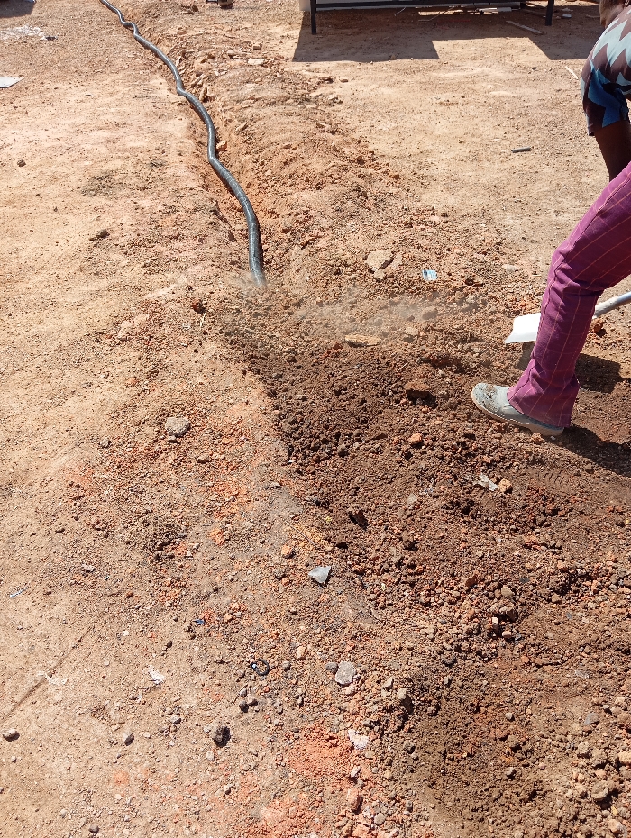A ground-level photograph depicts an outdoor worksite in DU, Nigeria. The scene consists primarily of dry, reddish-brown soil mixed with loose gravel and small rocks, indicating disturbed earth. A shallow, excavated trench runs diagonally from the lower-left to the upper-right, containing a black corrugated pipe. A localized cloud of dust or fine particles emanates from the soil around the pipe in the mid-ground, consistent with ongoing excavation or backfilling. On the right side of the frame, the lower body of an individual is partially visible. This person wears dark pink trousers with subtle lighter vertical stripes and light-colored slip-on shoes. Their left leg is positioned over an area of recently disturbed, darker soil. A shovel handle is partially discernible near their left foot. In the upper-right background, the lower torso and upper thighs of a second individual are partially visible, wearing patterned clothing. A dark, rectangular metal structure is also present in the upper-right background, casting a shadow. The scene is illuminated by direct sunlight, casting distinct shadows.