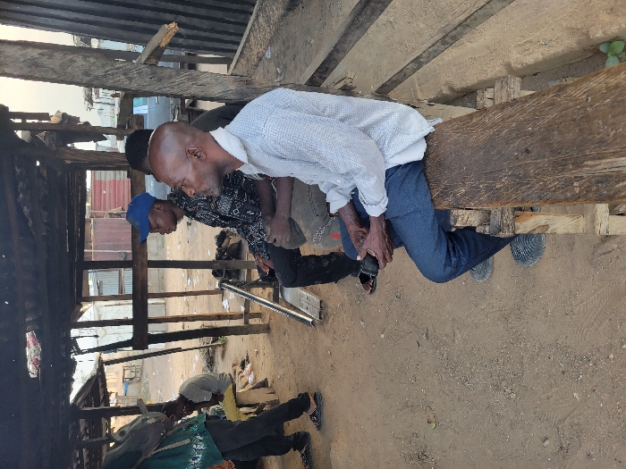 A group of men gathers under a rough wooden structure, possibly a makeshift shelter. One man in a white shirt sits on a wooden plank, his focus directed downwards towards his shoes. Another man, wearing a patterned shirt, stands beside him, also looking down. In the foreground, a figure dressed in a green shirt leans forward, while another individual with a blue cap is positioned further back. The setting appears to be an unpaved, sandy area with simple buildings visible in the background.