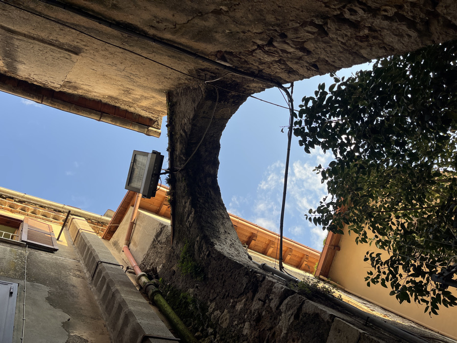 - "The image displays a low-angle perspective looking upwards through a narrow, enclosed passage in Fiuggi, Italy" by FM-X3uic2, licensed under CC BY 4.0