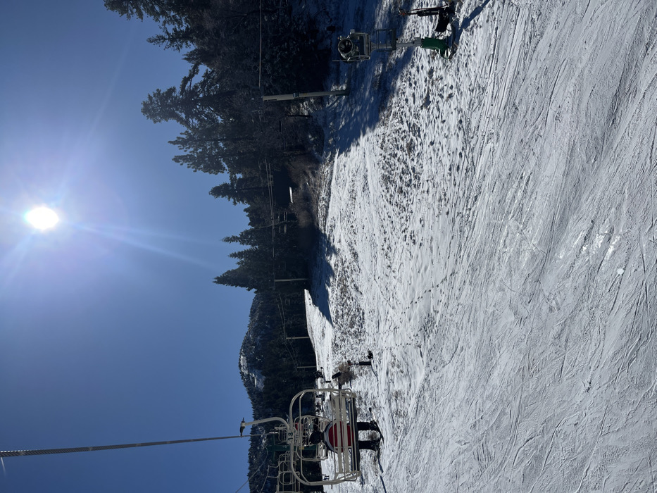 A snowy ski slope ascends beneath a bright sun and clear blue sky. A chairlift with seated skiers runs parallel to the slope. Dense forest flanks the left side of the image, its trees covered in snow. Ski tracks mark the surface of the slope, indicating previous skiers' paths. Some figures on skis are visible on the upper right.
