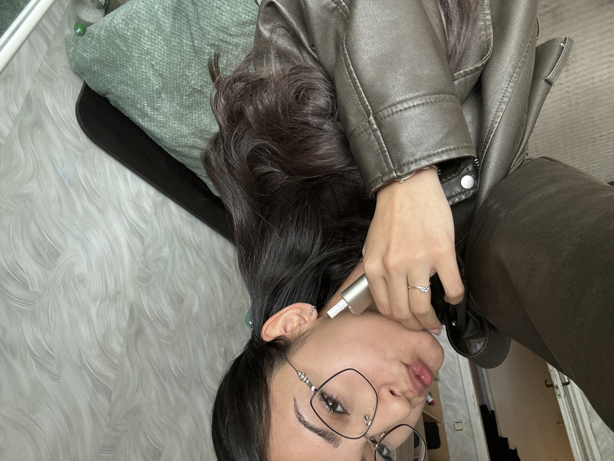 A young woman is holding a dermapen to her face. She has dark hair and is wearing glasses. She is wearing a leather jacket. There are pillows and other miscellaneous objects in the background, the wall behind her is white with vertical ridges. The location is likely an apartment and is not possible to determine if the photo was taken in Sofia, Bulgaria.
