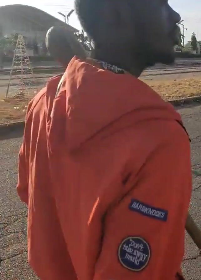 The video starts with a man wearing an orange jacket walking on a cracked road