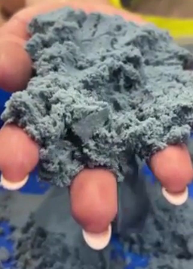 close-up of a hand holding a clump of blue-gray kinetic sand