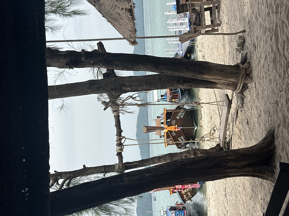 A tropical beach scene features a wooden swing hanging between two trees. In the background, several traditional Thai longtail boats rest on the sand near the ocean. The boats are detailed with ornate decorations. The shoreline has some wooden structures, and the sky is overcast. The picture appears to be taken from under a partially visible roof structure, adding depth and framing the idyllic beach view.