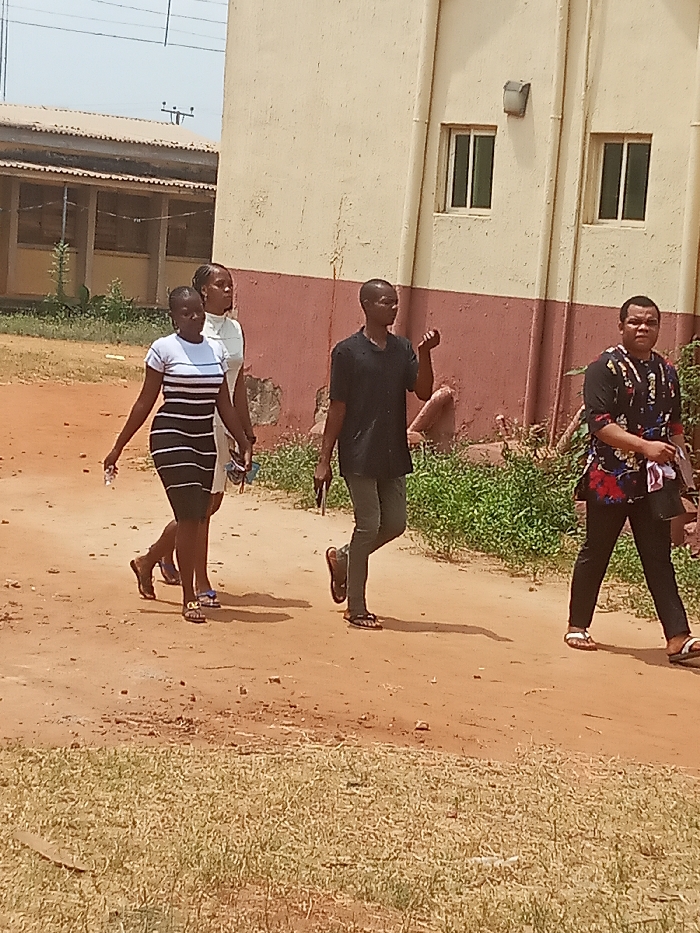 The image depicts an outdoor scene on a clear, sunny day in the city of Unknown, Unknown. Four individuals are present on a reddish-brown dirt path. The foreground features sparse, dry grass. To the right, a two-story building with a light beige upper facade and a reddish-brown lower section has two vertical rectangular windows with white frames and an exterior light fixture mounted above the rightmost window. A partially visible building with a corrugated metal roof is in the left background, with overhead power lines visible above it. From left to right, the first individual is a female wearing a black and white horizontal-striped short-sleeved top, a black skirt, and light-colored flat sandals; she holds a clear bottle in her right hand. Immediately behind her is a second female, partially obscured, wearing a light-colored top. Following them is a male in a dark t-shirt, dark trousers, and dark sandals, holding a dark object in his left hand and with his right hand partially raised. These three subjects are walking from left to right. On the far right, a fourth individual, a male, wears a black long-sleeved shirt with a multi-colored pattern, dark trousers, and light-colored flat sandals; he holds a light-colored object against his body with his left hand and walks from right to left, generally facing the other three subjects. There are no overt interactions observed between the individuals.