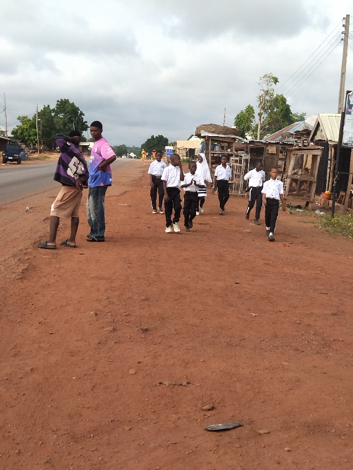 The scene takes place on a dirt road in the outskirts of Tuoniako, Nigeria, with coordinates 7.461 latitude and 7.157 longitude. There are two adults and eight children in the scene. All the children are dressed in white shirts and black pants. They are walking on the road in the same direction. The adults are standing together on the left side of the road, facing the camera. One adult is wearing a purple t-shirt and blue jeans and the other adult is wearing a pink t-shirt and black pants. There are several small buildings lining the road, and one vehicle can be seen in the background. The dirt road is the primary focus of the image. The terrain is dry, red, and dusty. There are trees and brush in the background. The sky is cloudy, but it appears to be a bright day.