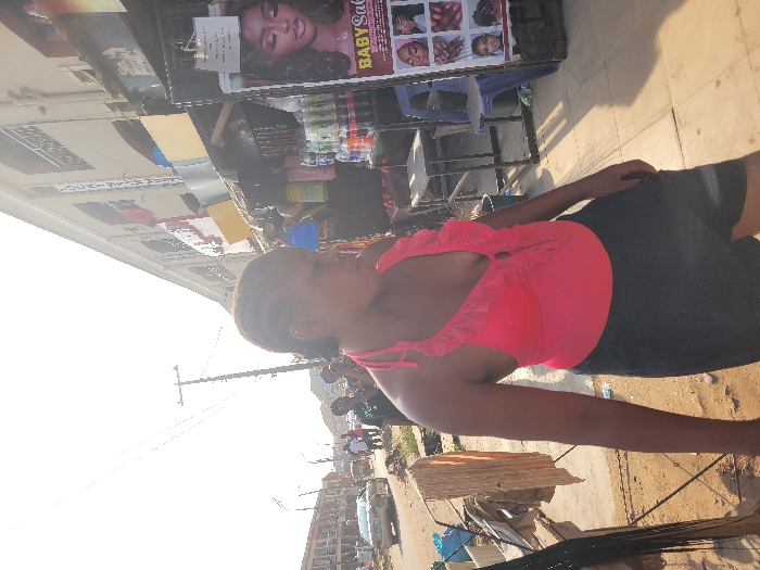 A woman stands on a sidewalk in front of a vendor selling hair products. She wears a bright pink top with a frilled neckline and dark skirt. A display of hair extensions and care products is visible. There are other people, cars, and buildings on the street.