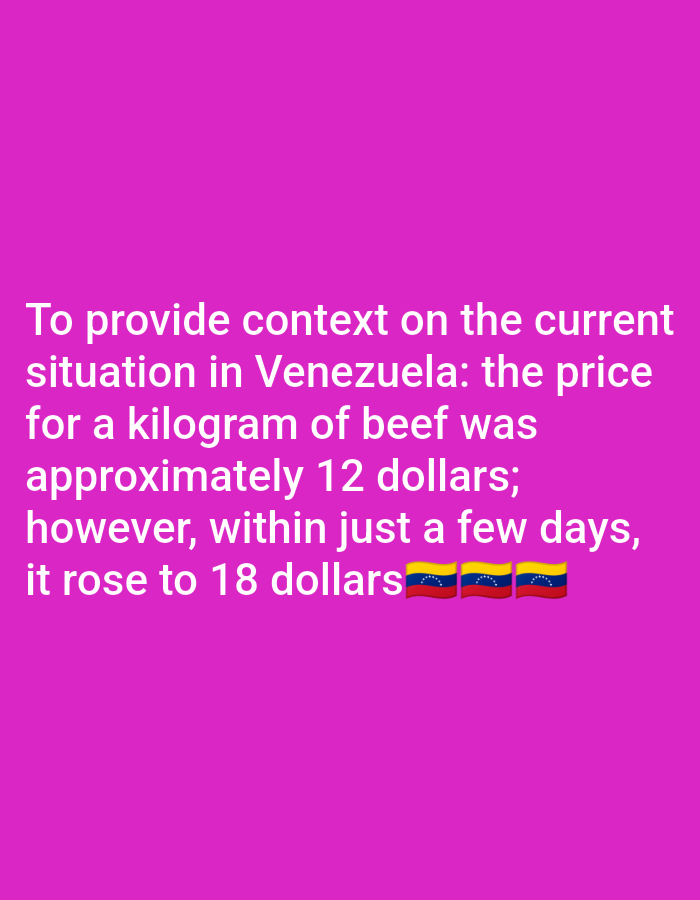 The image features a text-based statement against a magenta background. The text describes the economic situation in Venezuela, specifying that the price of a kilogram of beef increased rapidly, from approximately 12 dollars to 18 dollars within just a few days. The text concludes with three Venezuelan flag emojis. The image conveys a sense of economic instability in Venezuela through the dramatic price increase mentioned.