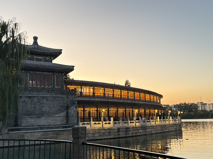 The image depicts a tranquil evening scene at a waterfront location in Xicheng District, China, likely within Beihai Park. A complex of traditional Chinese architecture is positioned alongside a body of water under a twilight sky. To the left, a multi-tiered pavilion with a dark tiled roof and ornate detailing rises above a dark stone wall. Its upper windows are visible. A weeping willow tree partially obscures the far left. Extending from this pavilion and curving towards the right is a long, two-story traditional building. Both levels are heavily illuminated from within, casting a warm orange-yellow glow through numerous latticed windows. The upper level features a continuous row of illuminated windows. The lower level includes a pedestrian walkway or balcony lined with white stone balustrades and lamp posts, from which light reflects onto the water. Indistinct human figures are visible on this lower level, some appearing seated at tables. The building's foundation is a stone retaining wall directly at the water's edge. The calm water surface reflects the warm lights of the building and the soft colors of the sky. The sky transitions from a pale blue at the top to a warm orange-yellow at the horizon, indicating sunset or early dusk. In the far distance on the right, across the water, a tree line and silhouettes of distant modern buildings are visible. A dark metal railing or fence is present in the immediate foreground, partially obscuring the water. No direct interactions between individuals are discernible; people are passively present within the illuminated structure.