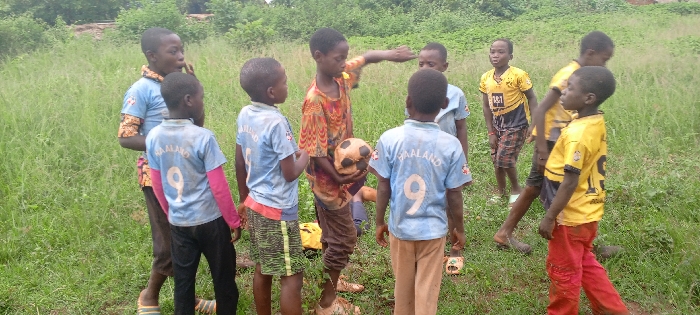 A group of nine children are standing in a grassy field. Some are wearing blue jerseys with the name "HAALAND" and the number 9 on the back. Others are wearing yellow and black jerseys. One child is holding a soccer ball and has his arm extended. The children appear to be interacting with each other, possibly discussing the game or their next move. The background shows green foliage.