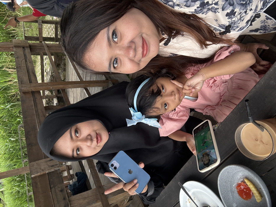 The image displays three individuals—two adult females and one young girl—seated at a dark wooden table in an outdoor or semi-outdoor setting. The adult female on the left wears a black hijab and holds a light blue iPhone in her left hand, making a peace sign. Her right hand is positioned near her chin. The young girl in the center, wearing a light blue headband with a polka-dotted bow and a pink ruffled dress, looks towards the camera with her left index finger touching her cheek. A white smartphone displaying a video game rests on the table in front of her. The adult female on the right, likely taking the photo, has long dark brown hair and wears a light-colored top with a dark floral pattern and frog closures. On the table, a glass of iced coffee with a black straw, a white plate with food remnants, and a gray speckled bowl containing red sauce and a yellow item are visible. The background features dark wooden railings and structures, behind which dense green vegetation, consistent with tall grass or reeds, is present. A person in a red shirt is partially visible in the far background. No explicit identifiers within the image confirm the location as Tamiajeng, Indonesia.