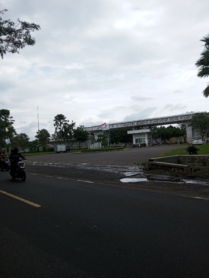 The image depicts a roadside view leading to a large institutional or facility entrance in Vaatharawattai, Sri Lanka, under an overcast sky. In the foreground, a dark asphalt road, marked with a yellow line on its left edge and faded white dashed lines, shows signs of wear and puddles of standing water near the right shoulder. Two individuals on dark motorcycles are observed moving away from the viewer on the road, with the lead rider wearing a dark helmet. The mid-ground is dominated by a substantial light-colored concrete overhead archway or pedestrian bridge spanning across an entrance road. Below this structure, a light-colored gatehouse or checkpoint building with dark window frames stands at the entrance. To the left of the gatehouse, a red and white flag is visible flying from a pole. A small white utility truck is parked to the left of the entrance building, and several motorcycles are parked near the gatehouse. The area surrounding the entrance is landscaped with various green trees and bushes. Denser foliage and distant, low-lying hills or landforms are discernible against the cloudy horizon in the background.