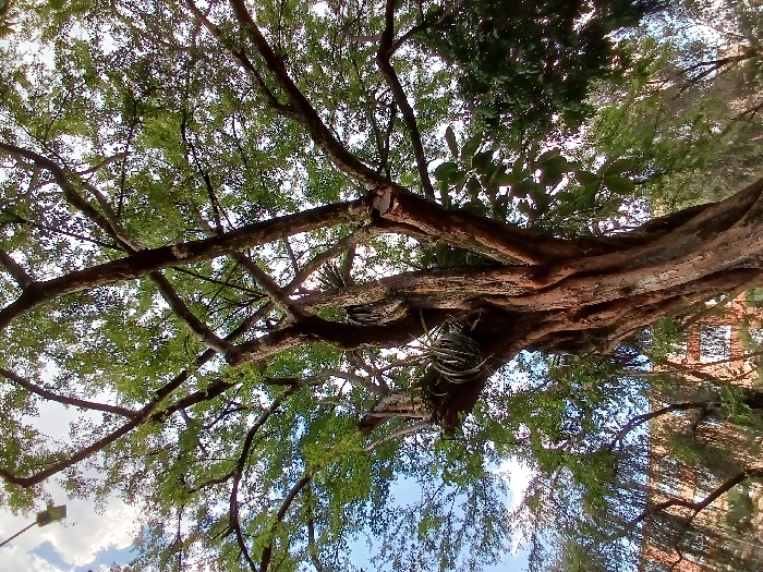 An upwards-angled view captures a tree with a thick, gnarled trunk