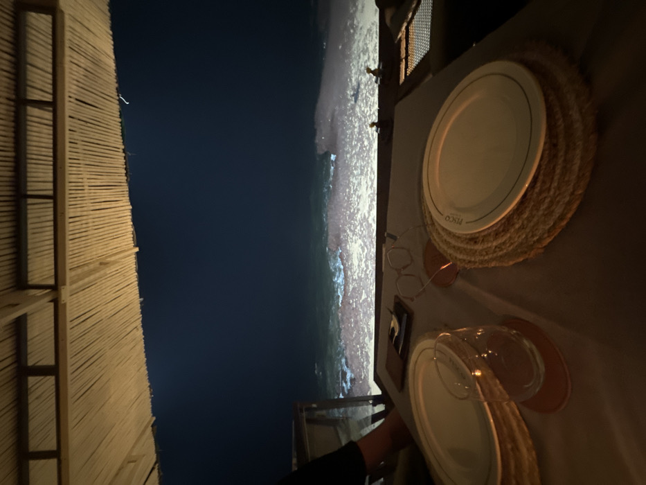 This image captures a nighttime scene at a beachside dining establishment in Anjuna, India. The view is from a seated position at a table, looking out towards the sea. The upper portion of the frame reveals a ceiling structure constructed from numerous light-colored, thin, parallel bamboo or reed-like slats, supported by darker structural beams, and illuminated with a warm light. Below the ceiling, a dark, featureless expanse of night sky and ocean dominates the middle ground. Directly beneath this dark horizon, a wide band of luminous, frothy white water is visible, indicative of waves breaking on a shoreline or shallow reef. The source of this luminescence is either natural (bioluminescence) or reflected artificial light. In the foreground, a dining table covered with a light-colored tablecloth is set. On the left, a stack of three white, rimmed dinner plates rests on a circular woven placemat, with a clear drinking glass on a circular coaster to its right. A human arm, clad in a dark sleeve, is partially visible on the far left, suggesting a person seated at the table. On the right side of the table, a single white dinner plate, marked with "PISCO" in green lettering, is placed atop a stack of several circular woven placemats. Centrally, between the two settings, a pair of light-rimmed eyeglasses rests on the tablecloth near a dark rectangular object, possibly a wallet, topped with a metallic utensil. Two small, dark, duck-shaped decorative figures are positioned along the low barrier separating the dining area from the illuminated water below. The scene is dimly lit by ambient, warm light, casting soft reflections on the table setting.