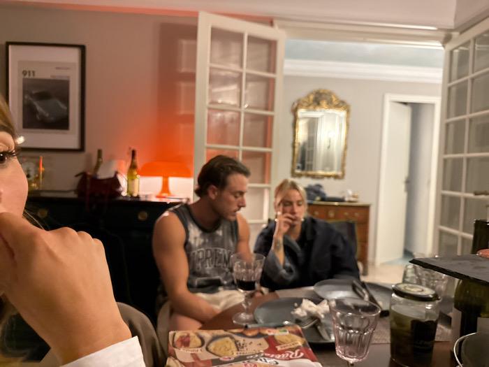 A group of people are gathered around a table for a meal. A man in a tank top and a woman in a dark jacket are visible. A glass of red wine is on the table. A picture of a Porsche 911 hangs on the wall. French doors open to another room with a gilded mirror. The scene is casual and indoors.