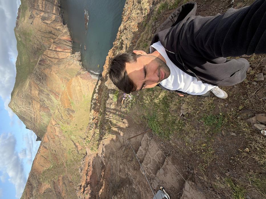 A man takes a selfie near the edge of a cliff overlooking the ocean