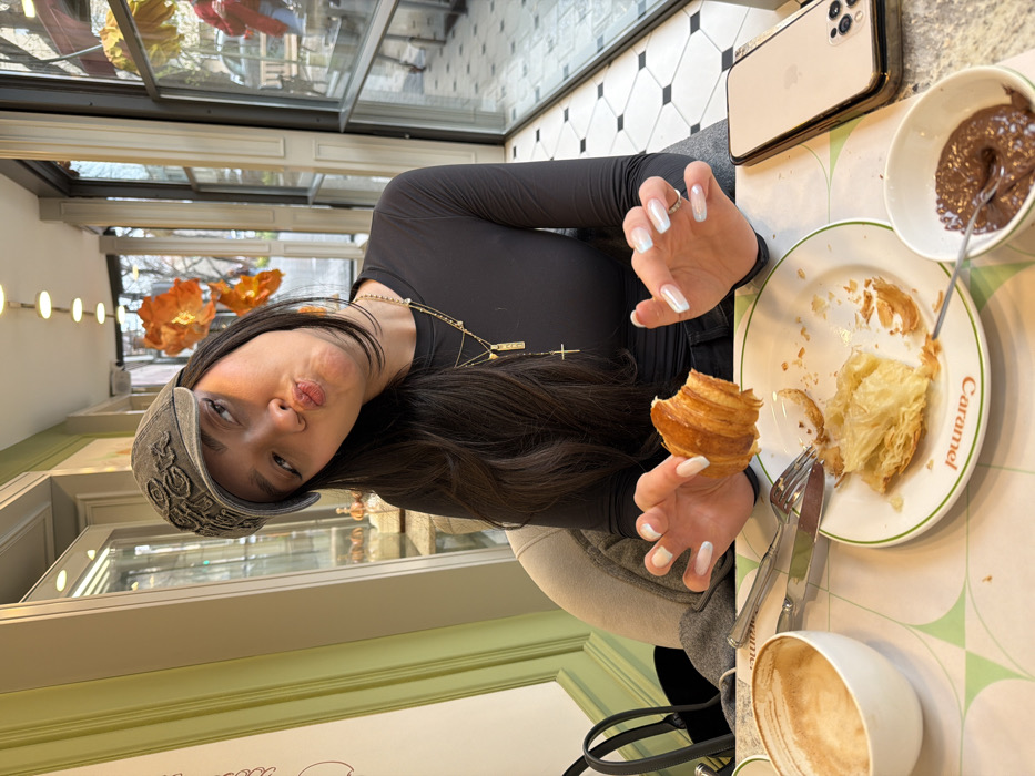 An individual is depicted seated at a table inside what is identified as Caramel cafe, located at 3 Sayat-Nova Avenue in Yerevan, Armenia. The subject, a female with long dark hair, wears a dark long-sleeved shirt and a dark distressed baseball cap. Multiple gold-toned necklaces, including one with a cross pendant, adorn her neck. Her fingernails display a light, iridescent ombré polish. She is looking towards the viewer with a "duck face" expression, lips puckered, and head slightly tilted. She holds a partially consumed croissant in her left hand, positioned above a white plate with a green rim bearing the text "Caramel." The plate contains croissant crumbs and a piece of pastry. Her right hand is also raised, fingers slightly spread. On the white table, alongside the plate, rests a white cup containing a minimal amount of light brown liquid residue, a fork, a knife, and a small white bowl filled with a dark brown spread, presumably chocolate, with a spoon immersed. A light-colored smartphone with a multi-camera system and a transparent case is situated to the right. The table is covered by a white placemat featuring a light green geometric pattern. The background shows a cafe interior with light green and white paneling. To the right, large windows offer a view of an outdoor street scene with blurred elements, including a person in red. Decorative orange, organic-shaped objects are suspended near the window. The floor visible through the window exhibits a black and white checkered pattern. Recessed ceiling lights are visible above.