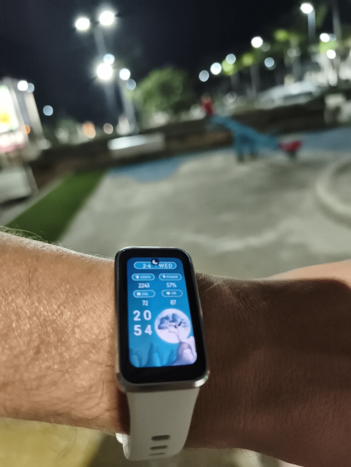 The image provides a first-person perspective, focused on a person's left forearm and a smartwatch, against a blurred backdrop of a public outdoor space at night in Baan Bo Phut, Thailand. **Foreground:** A hairy forearm, likely male, occupies the lower left quadrant. A rectangular smartwatch with a black case and a white silicone strap is worn on the wrist. The watch display is active, showing "2-4 WED" at the top, along with a crescent moon icon. Below this, "STEPS 2243", "POWER 57%", "CAL 72", and "87" (presumably heart rate) are visible. The time displayed is "20 54". The watch face background features a stylized tree silhouette against a prominent white full moon set against a teal-to-dark blue gradient. **Background:** The background is significantly out of focus, indicating a shallow depth of field. It depicts an outdoor area at night, illuminated by several bright, circular light sources from streetlights. A light-colored ground surface, possibly concrete or pavement, is visible, partially bordered by a strip of green artificial turf or grass. In the distant background, blurred playground equipment, specifically a blue and red seesaw, is discernible. A faint, blurred figure wearing a red top is visible near the seesaw. The environment appears to be a public park or playground.
