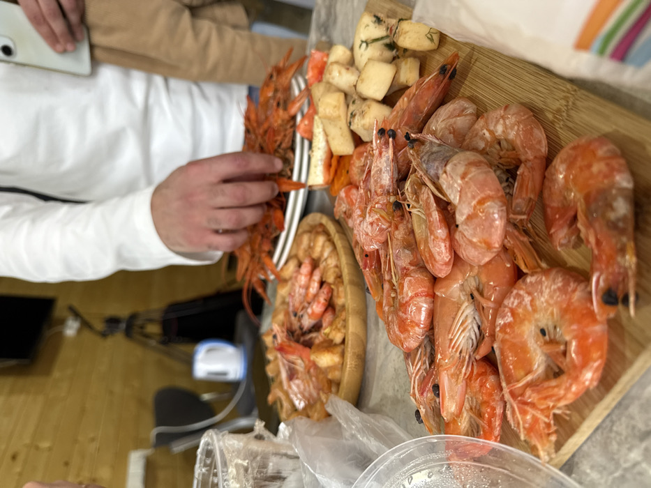 An indoor scene in Voskevaz, Armenia, displays a casual meal setup. In the immediate foreground, a wooden cutting board is laden with a large quantity of cooked, pink-orange shrimp. To the left, a clear plastic container is partially visible. Further back and to the left, a round wooden platter holds more cooked shrimp and fried potato pieces. Adjacent to this, a smaller wooden board features cubed, pale yellow items, possibly cheese or root vegetables, some with green seasoning. Centrally, a person wearing a white long-sleeved shirt is seen reaching with their right hand into a white plate piled with numerous cooked, bright red crayfish. Their left hand, partially visible, holds a light-colored smartphone. The background reveals a wall constructed of light-toned horizontal wooden planks. A dark flat-screen television is mounted on this wall, with a black tripod positioned beneath it. A white electric kettle or similar appliance is visible on a surface to the left of the tripod.