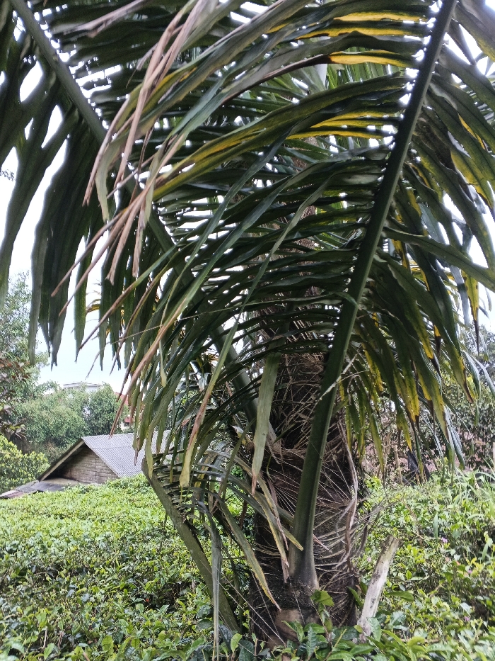 The image depicts a verdant, semi-rural landscape in the city of Unknown, Vietnam, characterized by dense foliage under an overcast sky. In the immediate foreground, a stout, dark-trunked palm-like plant dominates the center, with numerous long, slender fronds, predominantly dark green, some exhibiting yellowing or brown discoloration, extending outwards and upwards. The plant's trunk is partially obscured by its own fronds and foreground greenery. Below and behind this plant, a vast expanse of uniformly dense, low-lying green bushes, consistent with a tea plantation, covers the terrain. Within this plantation, to the left of the central plant, a single-story building is partially visible. It features a pitched roof constructed from grey corrugated material and light-colored walls, possibly brick or wood. The background consists of a dense canopy of various green trees, extending towards the horizon. No individuals or animals are present, and no specific actions or interactions are depicted. The lighting is soft and diffuse, typical of an overcast day.