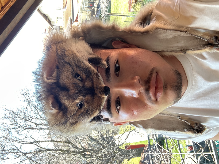 A young male subject, appearing to be in his late teens or early twenties, is depicted in a partial close-up, facing the camera directly. He has dark hair, dark eyes, a light mustache, and a goatee, and is wearing a plain white t-shirt. Positioned on his head is a fur hat fashioned from the complete pelt of a small mammal, possibly a raccoon or similar animal. The animal's head, featuring empty eye sockets and a dark snout, rests centrally on the subject's forehead, while the variegated brown fur pelt drapes down over his ears and shoulders. The background indicates an outdoor setting in Voluyak, Bulgaria, viewed from what appears to be a balcony or window. Visible elements include a large, leafless deciduous tree on the left, a dark metal railing, and a residential building with an orange tiled roof on the right. A fenced green lawn and additional vegetation are present in the middle ground, under a bright, clear daytime sky.