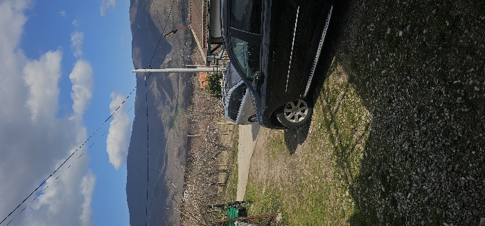 The image displays an outdoor scene under a partly cloudy blue sky with a mountain range in the distant background. The midground features numerous deciduous trees in bloom, indicative of springtime, forming an orchard or dense cluster. A dirt and gravel path is visible, curving from the left foreground into the midground. Two vehicles are parked on the right: a dark-colored SUV partially in shadow, showing its front wheel, side profile, and running board, and a silver station wagon or SUV parked behind it. A light-colored utility pole with wires extends upwards on the right side of the frame, near a section of a residential building with a terracotta-tiled roof. The foreground consists of scattered green grass, dirt, and gravel, with shadows cast across the ground. A partial view of a green, wheeled object is present behind a wire fence on the far left. The environment suggests a semi-rural or peripheral area within or around the city of Sliven, Bulgaria, given the mountainous backdrop consistent with the Balkan Mountains. No people are present.