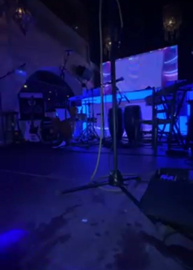 dark stage, lit with blue lights, and set up with various instruments. In the background, there is a drum set, guitars, a keyboard, and a screen displaying some form of animation or visuals. In the foreground, there is a microphone stand, and various stage equipment. The floor is visibly marked with what appear to be scuff marks. The overall environment appears to be a club or music venue, prepared for a performance.