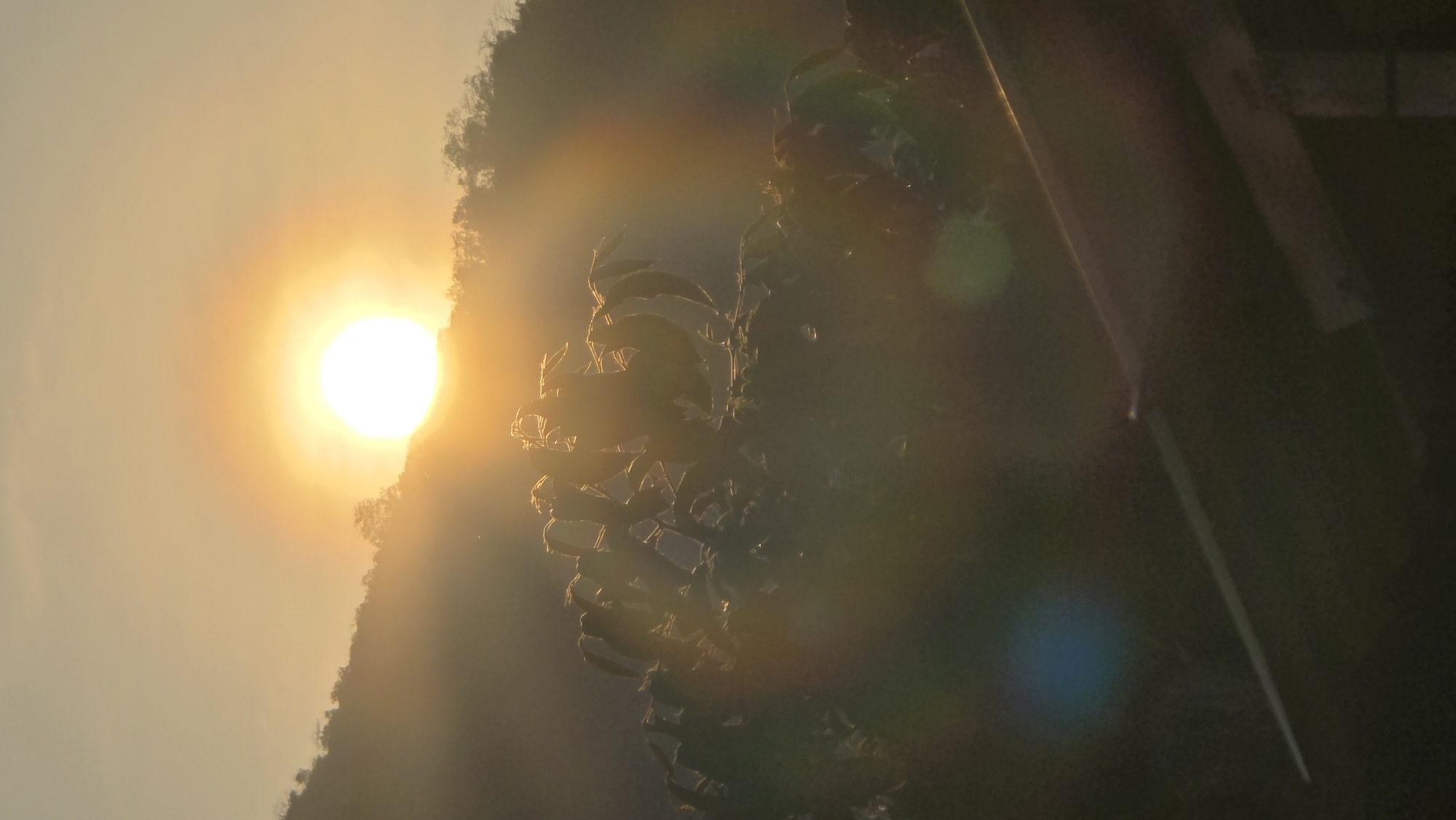 The image captures a sunset in Bac Natural Heritage Area Trang, Vietnam. The sun is a bright orb positioned near a mountainous or hilly landscape, partially obscured by the terrain. A cluster of tree branches or foliage appears silhouetted against the sunlight, adding a foreground element to the scene. A blurred object appears to be in the top right, and could be part of a building. The overall color palette is dominated by warm tones of yellow, orange, and brown, creating a hazy and ethereal atmosphere. The sun's glare produces a prismatic effect, creating a rainbow of colors.