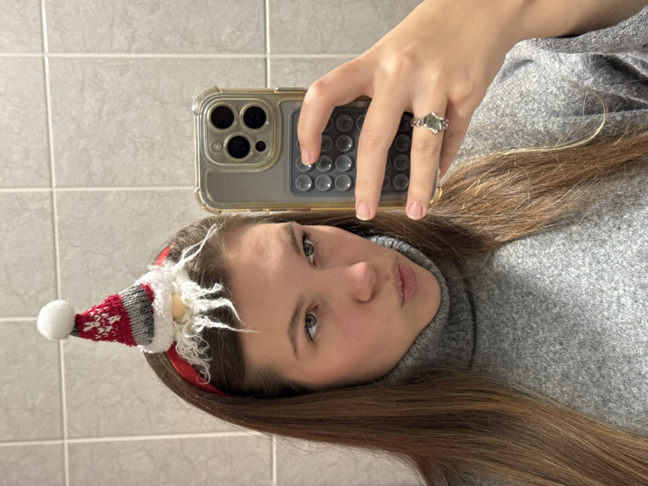 A woman is taking a selfie in a bathroom. She wears a grey turtleneck sweater and a Christmas-themed headband with a Santa hat. Her long brown hair is straight and hangs down her chest. The phone in her hand has a clear case, and her fingers obscure the lens. A ring is visible on her right hand. The bathroom has neutral-toned square tiles on the wall. The photo is taken at an angle, with the woman tilted to the side.